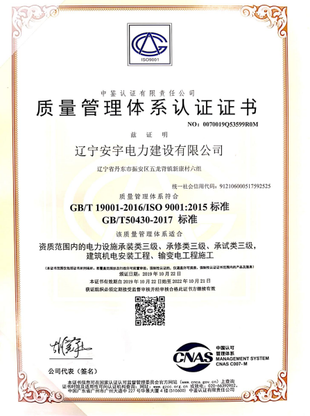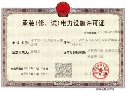安宇電建獲得地基基礎(chǔ)工程叁級(jí)資質(zhì),建筑機(jī)電安裝工程承包叁級(jí)資質(zhì),輸變電工程承包叁級(jí)資質(zhì)及東北能源局叁級(jí)承裝,叁級(jí)承修,叁級(jí)承試資質(zhì)